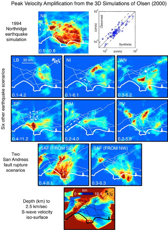 The other working-group effort toward building the master model is Phase III. The goal of the SCEC Phase III Report was to investigate the extent to which site effects can be accounted for in probabilistic seismic hazard analyses of southern California. (see http://www.scec.org/phase3) The report is composed of a collection of 14 papers, all of which are now in press as a special, separately bound issue of BSSA, that should be published by the end of the year. There are a lot of very interesting findings. The top three are listed here: Figure_08_Olsen_simulations.jpg, adapted from Kim Olsen's Phase III paper, exemplifies the intrinsic variability of site amplification with respect to source location nicely. What's shown are site amplification maps from 3D finite difference simulations for nine different earthquakes. Note the significantly different amplification pattern among the earthquake scenarios, even for identical ruptures on the SAF - except where rupture starts on opposite ends of the segment. This means that the attenuation-relationship approach of representing ground motion is reaching a point of diminishing returns. Yes, some important improvements can and should be made, but it's doubtful that we will ever dramatically reduce sigma - a fact at odds with the prevailing perspective in the engineering community. Our best hope for more accurate estimate of earthquake ground motion are via waveform modeling (as in Figure_08_Olsen_simulations.jpg). However, such capabilities are in their infancy, especially in terms of having reliably methodologies that can be applied routinely in engineering practice. This led to discussion at last year's (1999) SCEC meeting about whether Figure_09_1999_MM.jpg is now a more appropriate master model: The two approaches to hazard analysis are shown: PSHA vs waveform modeling. They're complementary, and we need both. PSHA gives composite hazard and thereby identifies most hazardous scenario(s), via disaggregation, for a given location. Synthetic waveforms could then be generated for these events for use in nonlinear structural analysis in engineering design (sometimes called "performance based design", but I'm told by some that the latter is not the correct usage, as PSHA can be used in performance based design). We can envision such a clickable, community master model sometime in the future. Engineers are waiting for reliable waveforms before moving to nonlinear dynamic analyses, whereas seismologists are waiting for the demand before developing the modeling capabilities. SCEC-2 could break this gridlock and thereby drive a revolution in seismic hazard analysis. I can provide more arguments in favor of this approach if asked for. Using Figure_09_1999_MM.jpg as the new master model may be offensive to some in that it's too applied.